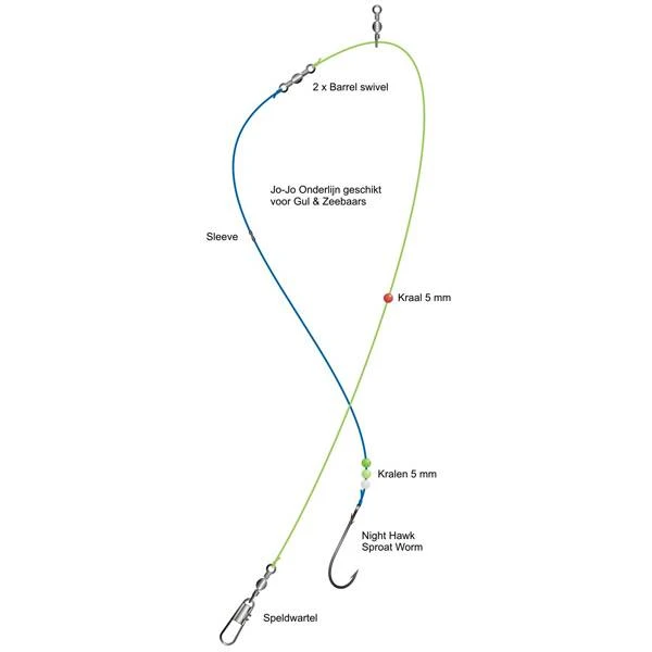 De Midnight Moon JoJo onderlijn is gemaakt voor het vissen op zeebaars. Door het unieke systeem krijgt u de aanbeet beter door op de hengel en kan de vis zich moeilijker vast zwemmen.